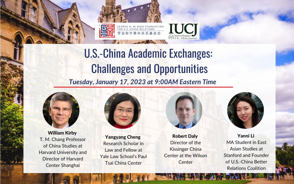 Join the George H. W. Bush Foundation for U.S.-China Relations and the Intercollegiate U.S.-China Journal for a webinar on “U.S.-China Academic Exchanges: Challenges and Opportunities” happening on January 17, 2023 at 9AM Eastern Time/8AM Central Time. The panel includes professors, students as well as academic policy experts, and will be moderated by Bush China Foundation President and CEO David Firestein.