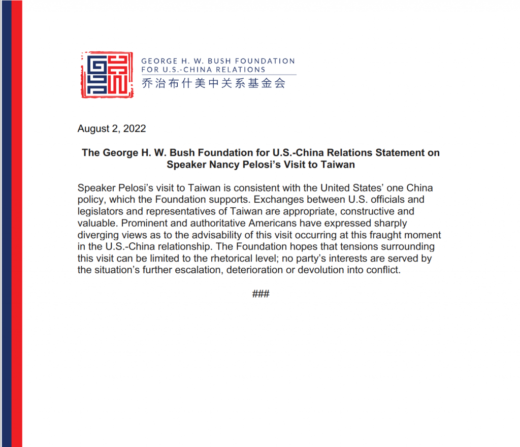 The George H. W. Bush Foundation for U.S.-China Relations Statement on Speaker Nancy Pelosi’s Visit to Taiwan